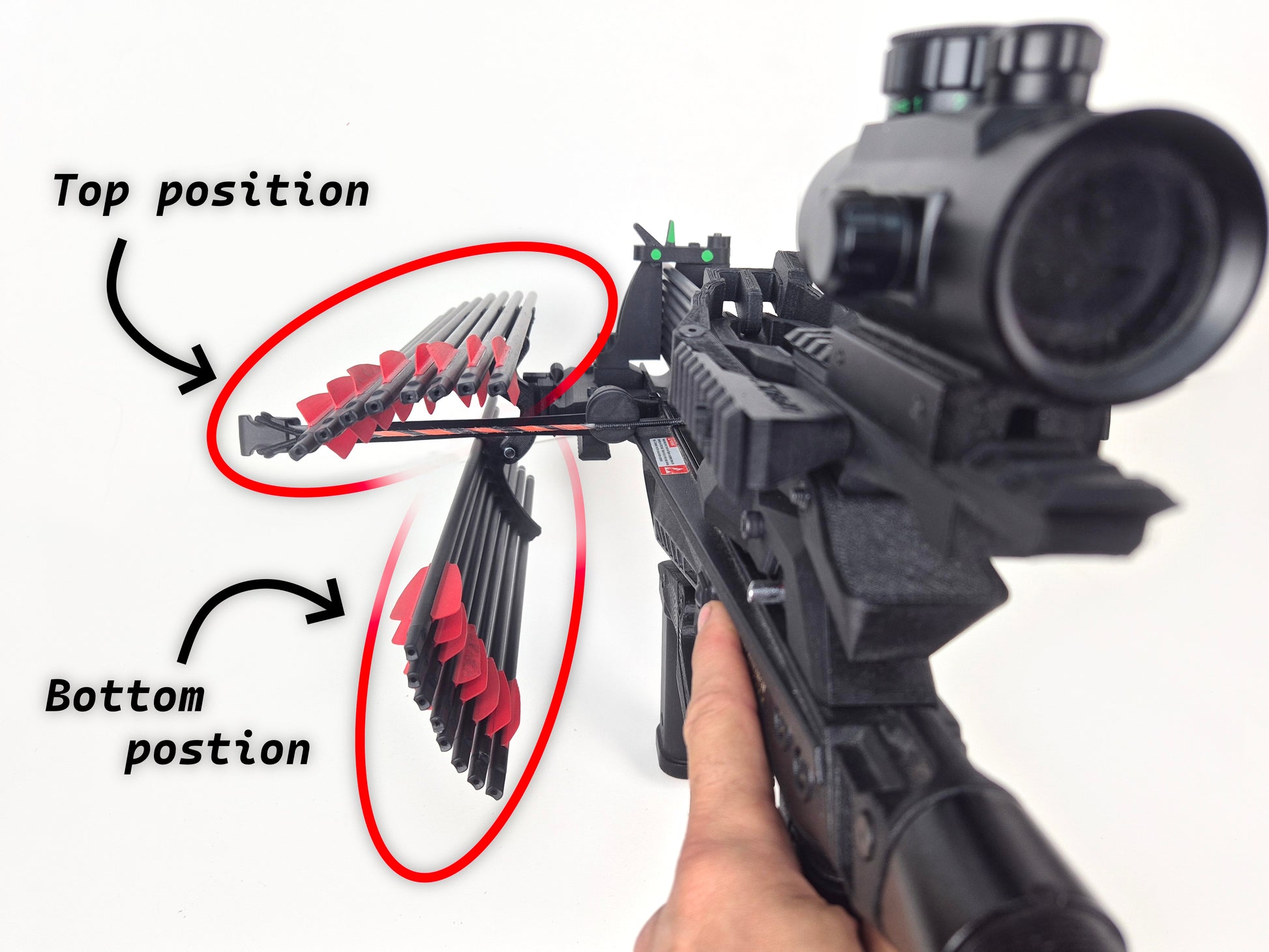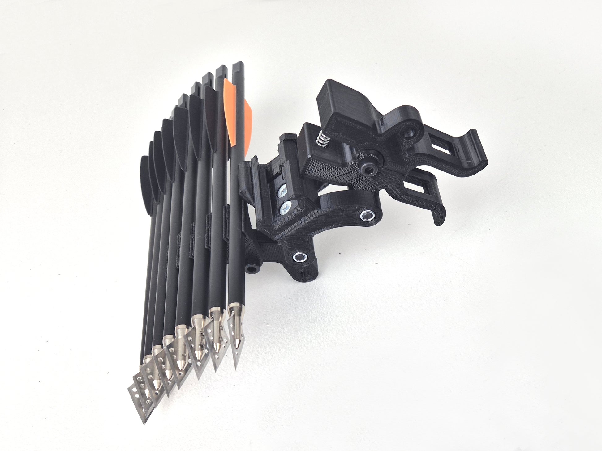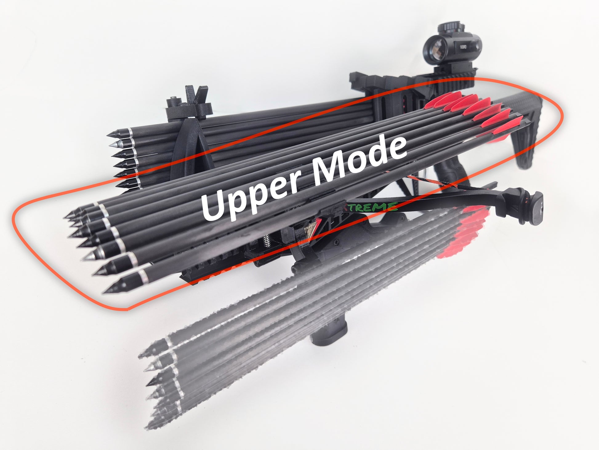 This UPBOLT setup is designed for holding 8 bolts on the crossbow and easy sequential bolt feed into crossbow (aka tactical magazine reload to prevent it becoming empty).