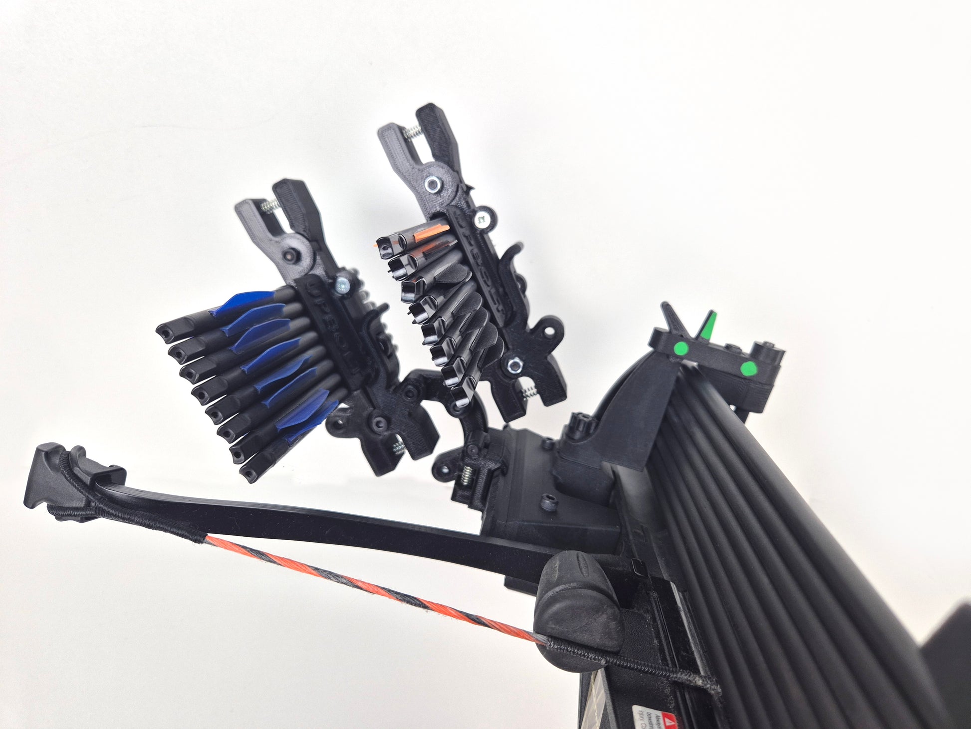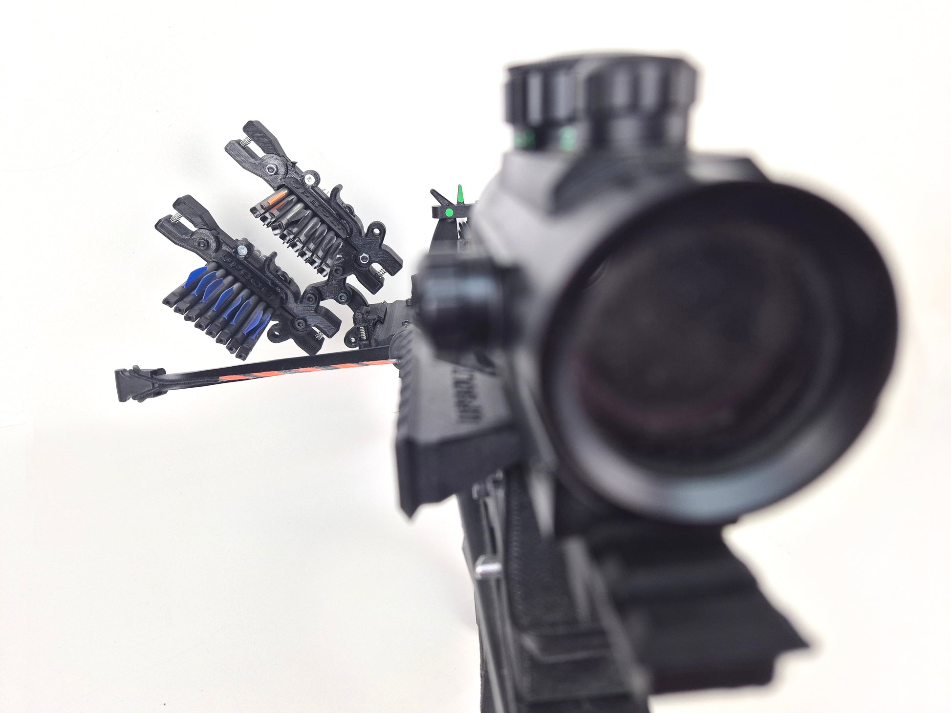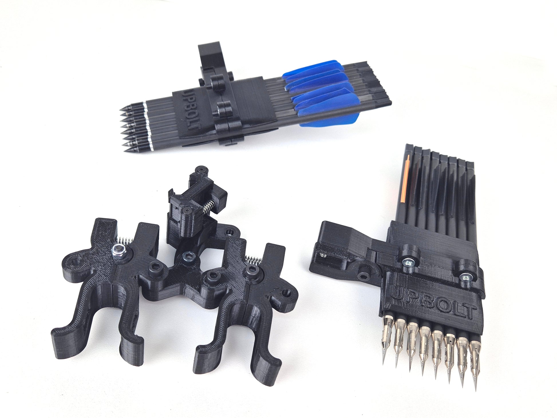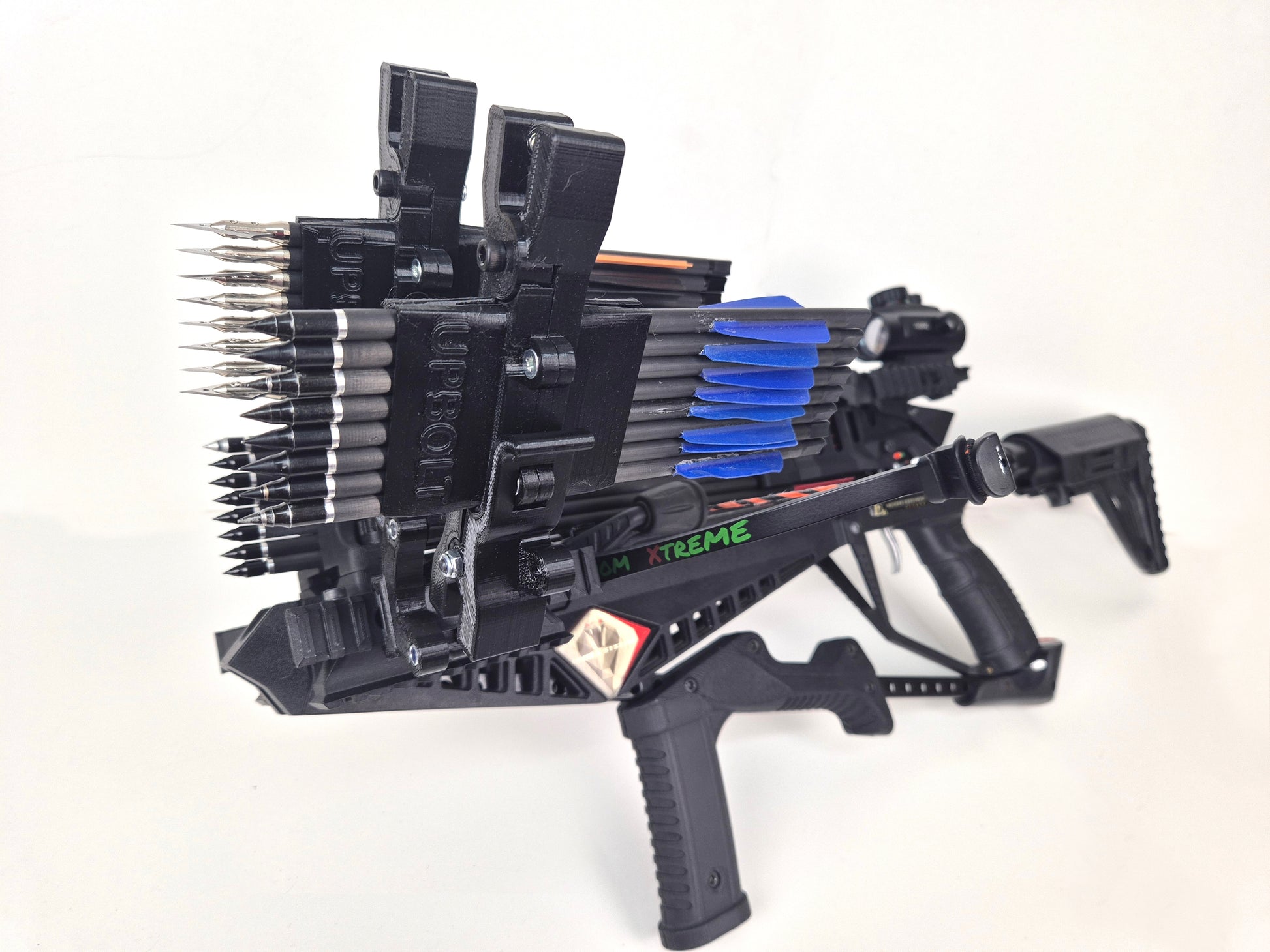 This UPBOLT setup is set of components for holding 16 bolts on the crossbow (two bolt loaders with 8 bolts each) and quick bulk load of bolts into magazine (aka full magazine reload).